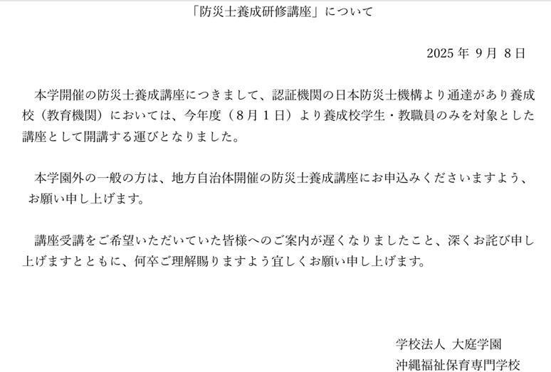令和3年度に日本防災士機構より認証をいただき、沖縄県内で初、「防災士養成研修機関」として研修を実施しています。